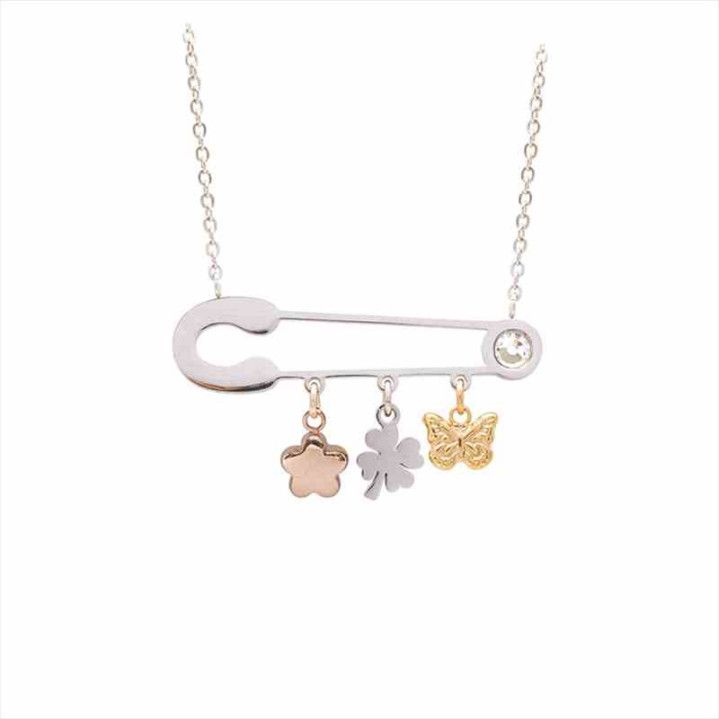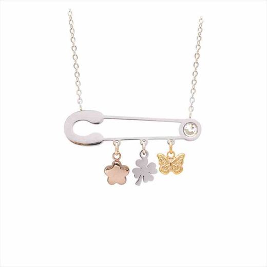 Collar Acero N15455 Imperdible Con Flor Trébol Y Mariposa. Collar fabricado en acero inoxidable. Cierre mosquetón. Diseńo de Imperdible Con Flor Trébol Y Mariposa. Certificado de autenticidad y garantía de calidad en los materiales de fabricación. Ref N15455