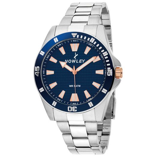 Nowley herrklocka 8-0024-0-3 stål. 43 mm stålhölje. Armband av stål. Blå ram. Blå urtavla och rosa visare. kvarts. Dränkbar 50m. 3 års garanti. Ref 8-0024-0-3.