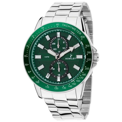 Nowley herrklocka 8-0049-0-3 stål. 44 mm stålhölje. Armband av stål. Grön ram. Grön urtavla och silvervisare. Multifunktion. Kalender. kvarts. Dränkbar 50m. 3 års garanti. Ref 8-0049-0-3.