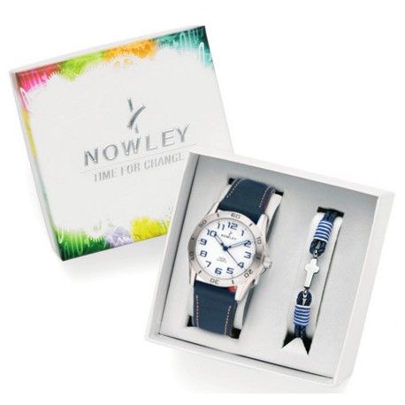 Pack Reloj Nowley Infantil 8-0989-0-2 Acero Piel Azul Analogico Pulsera Piel Azul. Caja de acero inoxidable. Bisel plateado. Brazalete de piel azul. Cierre hebilla de acero inoxidable. Esfera blanca. Horas, minutos, segundos. Cristal mineral. Movimiento quartz. Sumergible 50m. Pulsera piel Azul. 3 ańos de garantía. Ref 8-0989-0-2