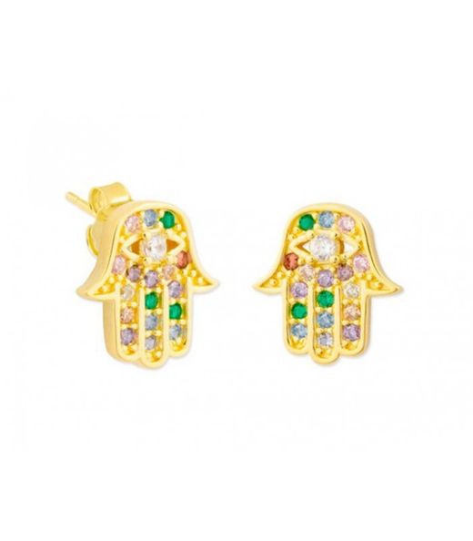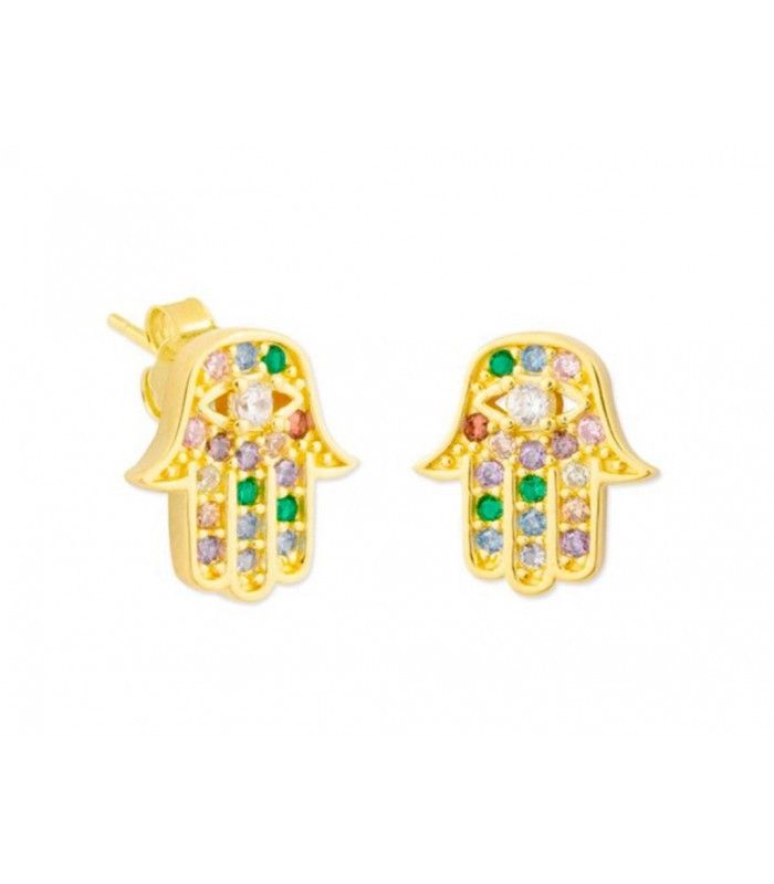 Pendientes Plata Dorada Liska MED320A-D Mano Fátima. Pendientes fabricados en plata dorada de ley 925 con baño de oro 18kts. Diseño de mano de fátima con piedras multicolor. Colección MEDITERRANEA. Certificado de autenticidad y garantía de calidad en los materiales de fabricación. Ref MED320A-D