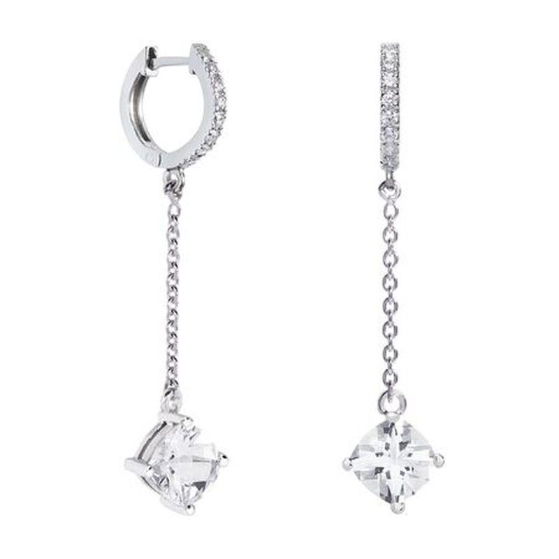Pendientes Plata Rombo Argyor MRM 7x7mm (AG)79B0407TC1 Topacios Blanco. Pendientes fabricados en plata de ley 925 925/000. Peso 2,74gr. Cabezales con forma de aro con pavé con 8 topacios blancos, total 16 topacios de 1,50mm. Cierre click.Diseño central de cada pendiente con cadena de 1,9cm. Terminados con dos Topacios en talla cushion 7x7mm de color blanco. Certificado de autenticidad y garantía de calidad en los materiales de fabricación. Ref (AG)79B0407TC1