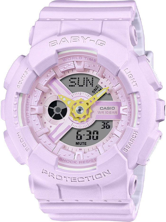 Reloj Baby-G Casio Mujer BA-110AH-6A Resina Morado Sport Analógico-Digital. Caja de resina morada de 43,4mm de diámetro. Bisel de resina morada. Brazalete de resina morada. Cierre de hebilla de acero inoxidable. Esfera morada. Multifunción, horas, minutos, segundos, mes, fecha, día de la semana, alarma, hora mundial, 29 zonas horarias, activacion/desactivación horario verano, luz led, cronógrafo, timer cuenta atrás. Cristal mineral. Movimiento quartz. Resistente a los golpes. Peso: 45gr. Sumergible 100m. 3 ańos de garantía. Ref BA-110AH-6A