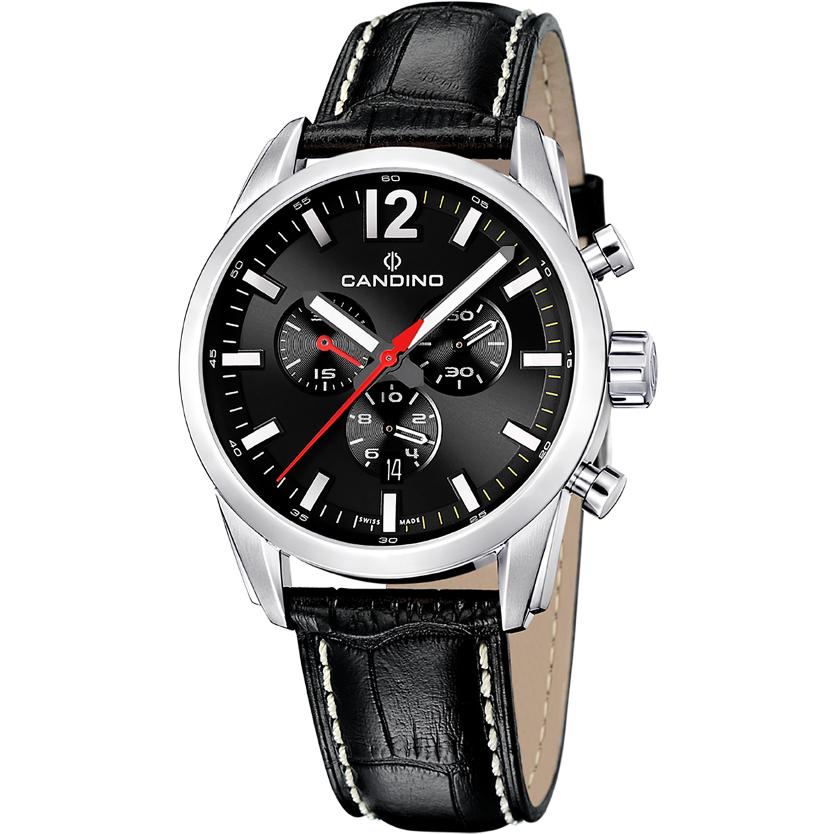 Reloj Candino Hombre C4408/9 Piel Negra Acero Cronógrafo Analógico. Caja de acero de 44mm de diámetro. Bisel plateado. Correa de piel negra. Cierre hebilla. Esfera negra. Multifunción, calendario, cronógrafo. Cristal zafiro. Movimiento quartz. Swiss Made. Sumergible 100m. 3 años de garantía. Ref C4408/9