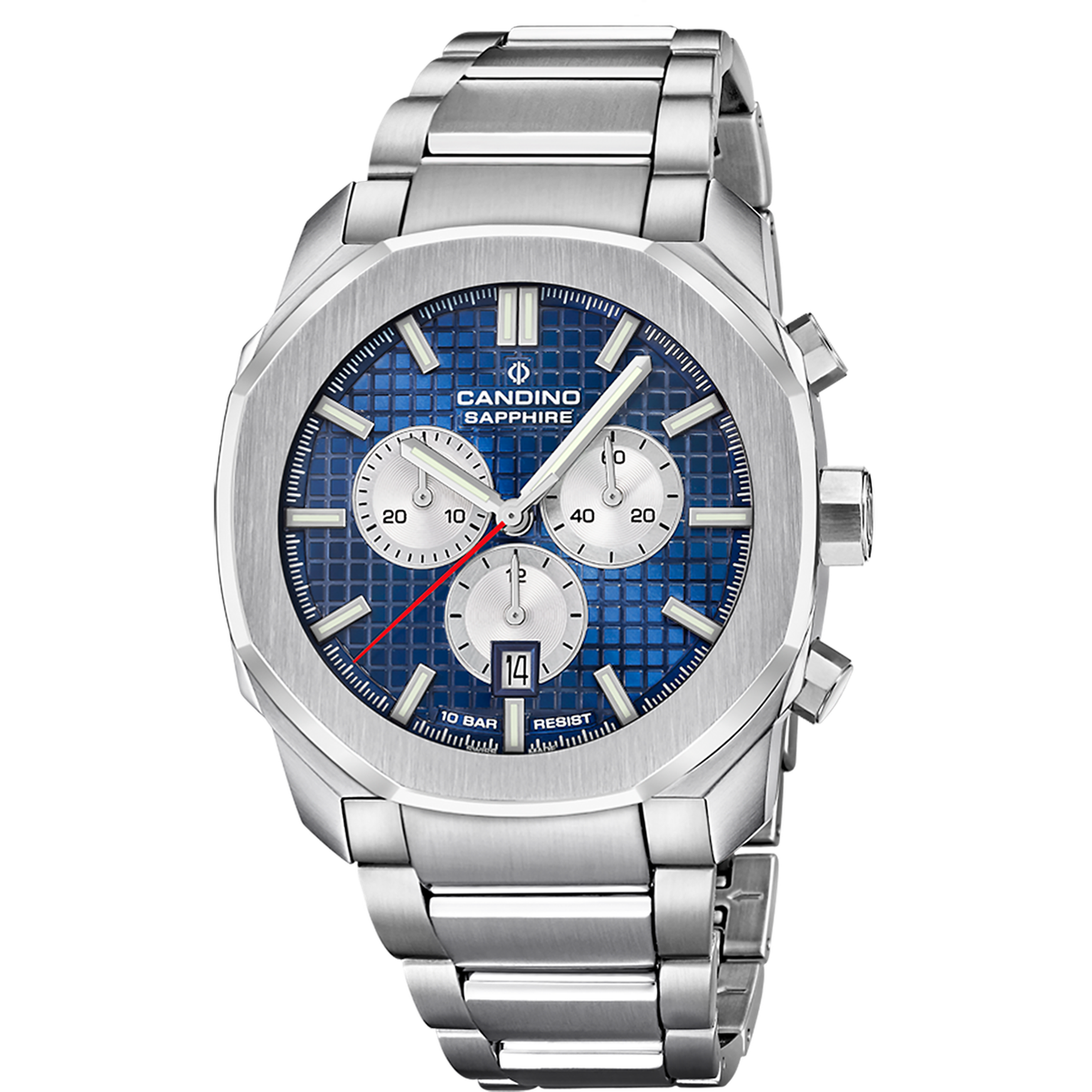 Reloj Candino Hombre C4746/1 Acero Cronógrafo Analógico. Caja de acero inoxidable de 44mm de diámetro. Bisel plateado. Brazalete de acero inoxidable. Cierre desplegable. Esfera azul. Multifunción, calendario, cronógrafo. Cristal zafiro. Movimiento quartz. Swiss Made. Sumergible 100m. 3 años de garantía. Ref C4746/1