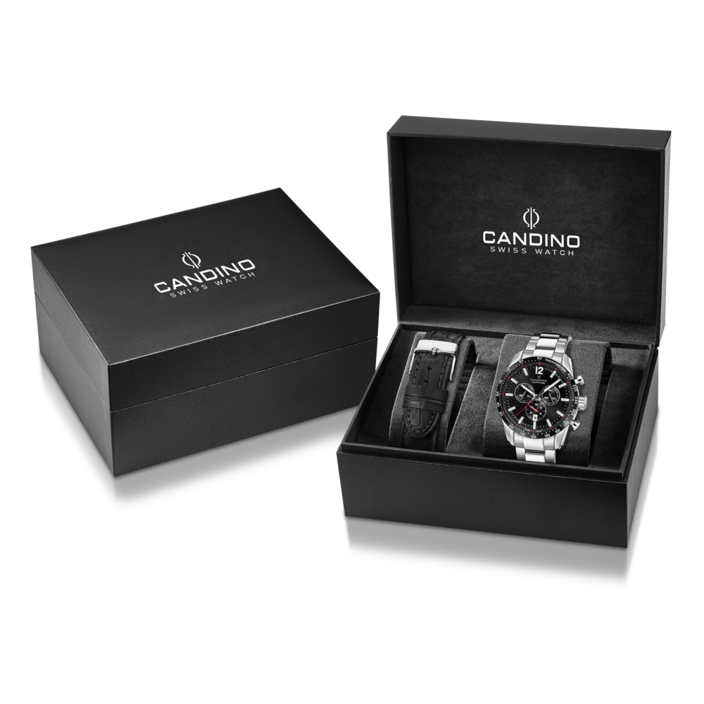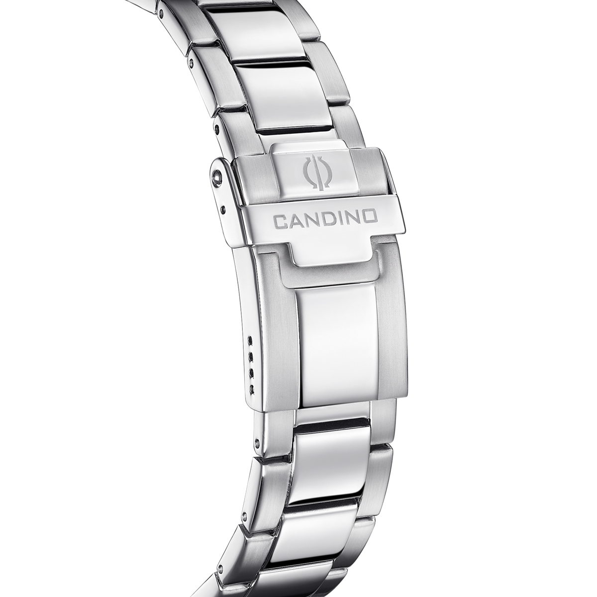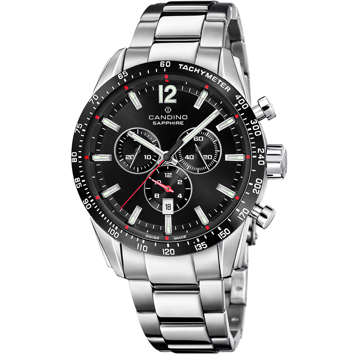 Reloj Candino Hombre C4757/G Acero Cronógrafo Analógico. Caja de acero plateado de 45mm de diámetro. Bisel negro. Brazalete de acero inoxidable. Incluye una correa de piel negra. Cierre desplegable. Esfera negra. Multifunción, calendario, cronógrafo. Cristal zafiro. Movimiento quartz. Swiss Made. Sumergible 100m. 3 años de garantía. Ref C4757/G