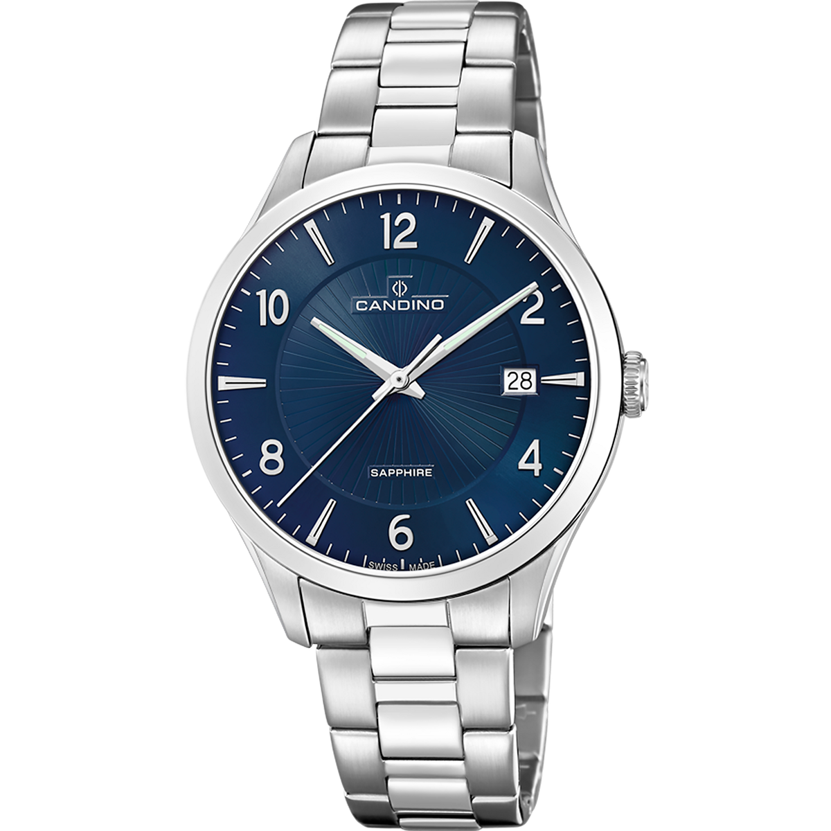 Reloj Candino Hombre C4798/2 Swiss Made Acero Analógico. Caja de acero inoxidable de 39,3mm de diámetro. Bisel plateado. Brazalete de acero inoxidable. Cierre desplegable. Esfera azul. Multifunción, calendario. Cristal zafiro. Movimiento quartz suizo. Sumergible 50m. 3 años de garantía. Ref C4798/2