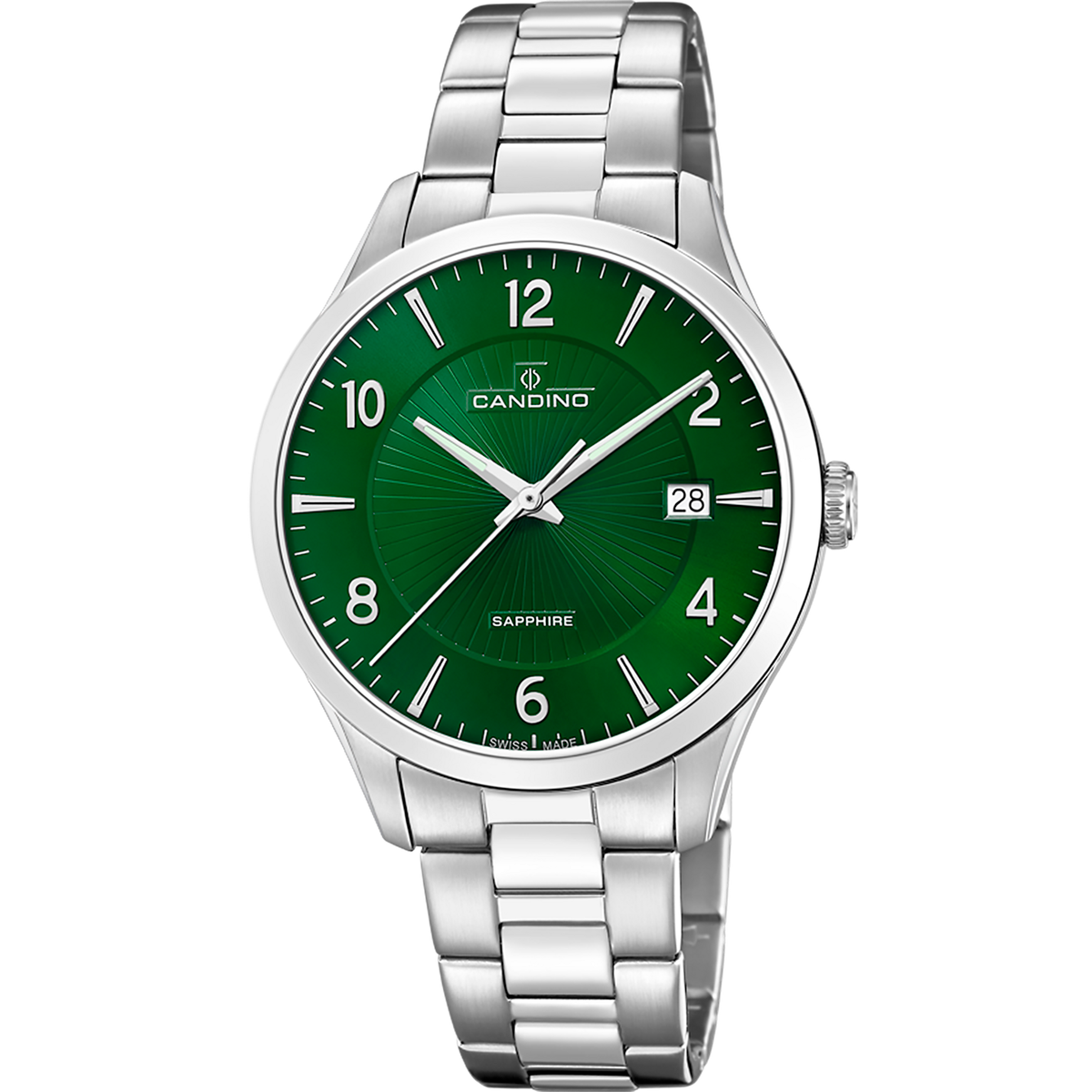 Reloj Candino Hombre C4798/3 Swiss Made Acero Analógico. Caja de acero inoxidable de 39,3mm de diámetro. Bisel plateado. Brazalete de acero inoxidable. Cierre desplegable. Esfera verde. Multifunción, calendario. Cristal zafiro. Movimiento quartz suizo. Sumergible 50m. 3 años de garantía. Ref C4798/3