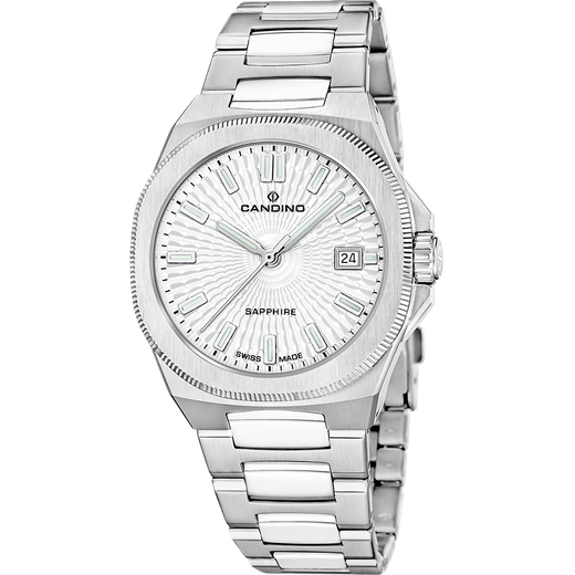 Reloj Candino Hombre C4799/1 Swiss Made Acero Analógico. Caja de acero de 39,5mm de diámetro. Bisel plateado. Brazalete de acero inoxidable. Cierre desplegable. Esfera plateada. Multifunción, calendario. Cristal zafiro. Movimiento quartz suizo. Swiss Made. Sumergible 100m. Peso 144gr. 3 años de garantía. Ref C4799/1