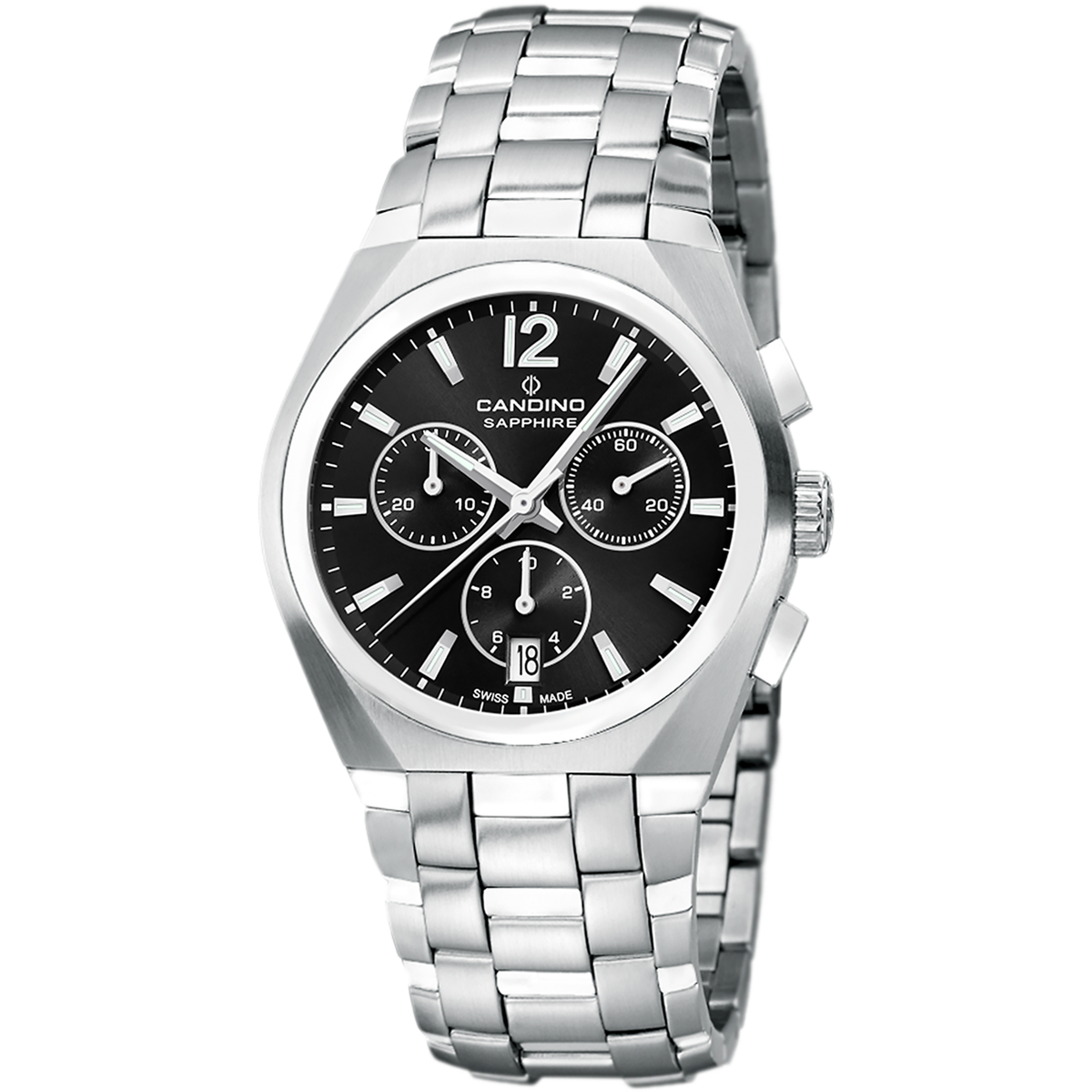 Reloj Candino Hombre C7511/N Acero Cronógrafo Analógico. Caja de acero de 45,3mm de diámetro. Bisel plateado. Brazalete de acero inoxidable plateado. Cierre desplegable. Esfera negra. Multifunción, calendario, cronógrafo. Cristal zafiro. Movimiento quartz. Swiss Made. Sumergible 100m. 3 años de garantía. Ref C7511/N