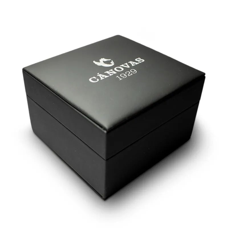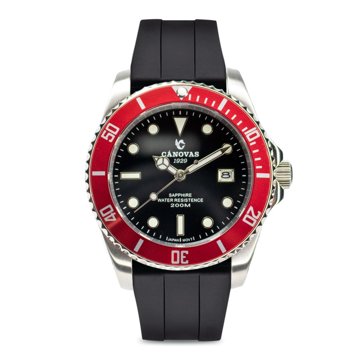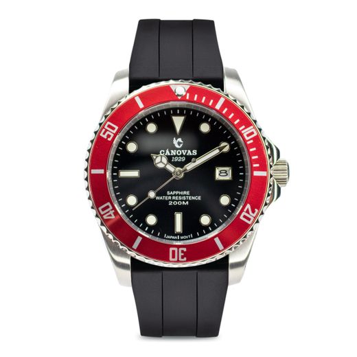 Reloj Cánovas 1929 Hombre CA1929-514 Sport Negro Acero Analógico. Caja de acero inoxidable de 42mm de diámetro. Bisel alumino giratorio color rojo. Correa de silicón negro. Cierre hebilla. Esfera negra. Índices luminiscentes. Calendario. Cristal zafiro. Corona a rosca protegida. Tapa sellada a rosca. Movimiento japonés de cuarzo Miyota. Sumergible 200m. Edición limitada 350 unidades numeradas. 3 años de garantía. Ref CA1929-514