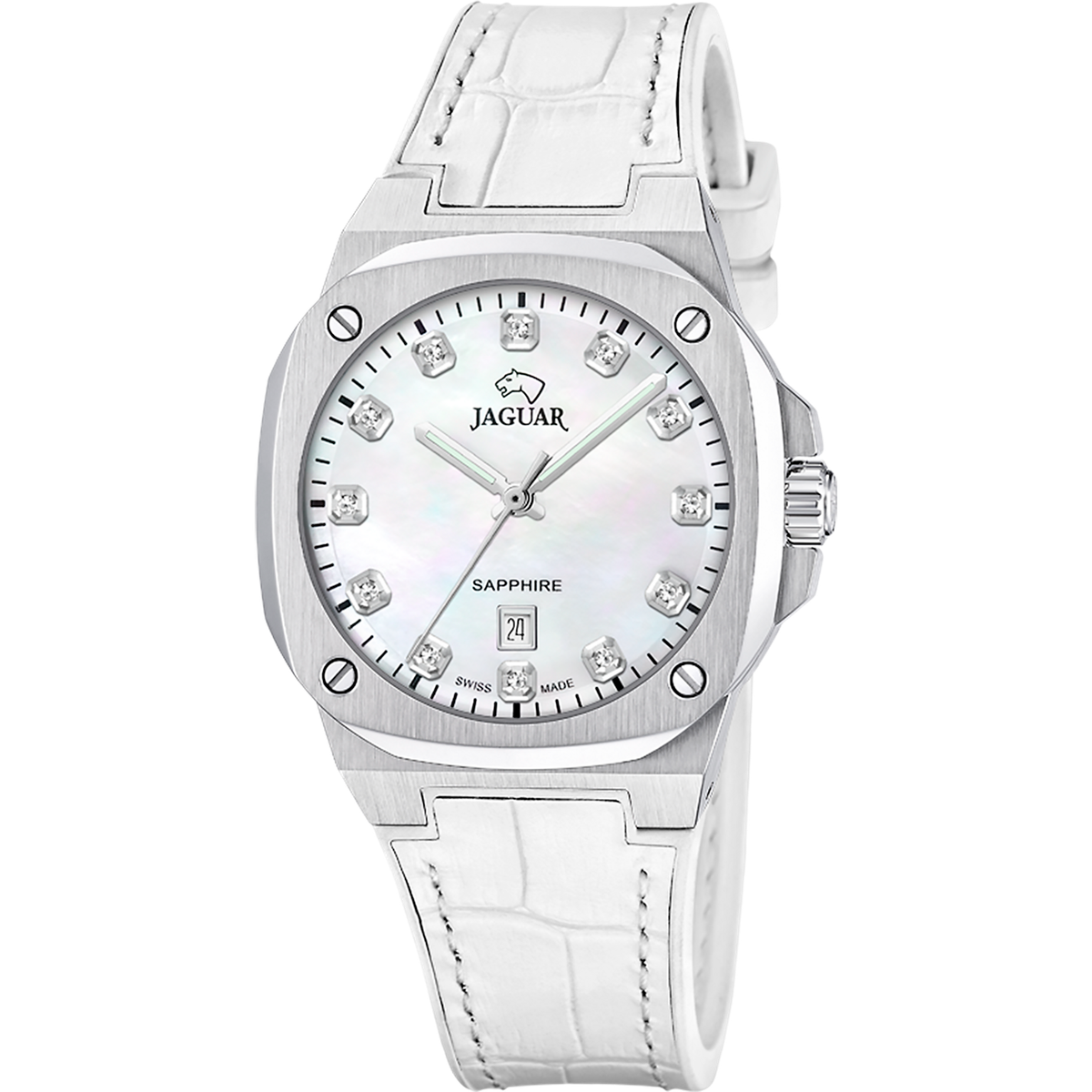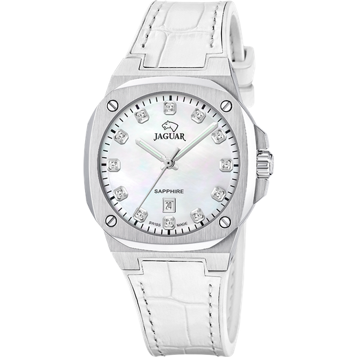 Reloj Jaguar Mujer J1032/6 Swiss Made Piel Blanca Acero Analógico. Caja de acero de 34,3mm de diámetro. Bisel plateado. Correa de piel blanca. Cierre hebilla. Esfera blanca. Multifunción, calendario. Cristal zafiro. Movimiento quartz suizo. Swiss Made. Sumergible 100m. 3 años de garantía. Ref J1032/6