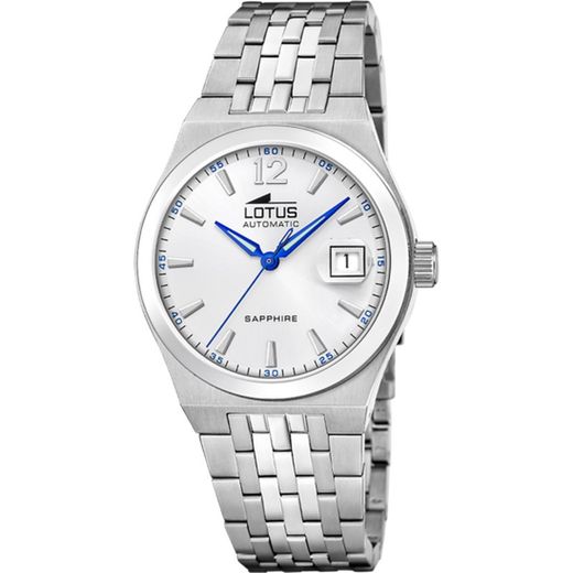 Reloj Lotus Hombre 19000/1 Acero Automático. Caja de acero de 39mm. Brazalete de acero. Cierre desplegable. Esfera plateada con agujas azules e indices blancos. Multifunción, calendario. Cristal zafiro. Movimiento automático miyota 8215. Sumergible 100m. 3 ańos de garantía. Ref 19000/1