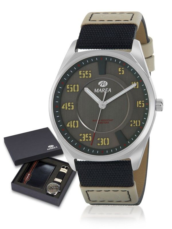 Reloj Marea Hombre B54240/5 Nylon Negro + Billetera. Caja de acero de 42mm. Correa de nylon negro. Cierre hebilla. Esfera gris. Cristal mineral. Movimiento quartz. Sumergible 50m. Billetera de piel negra de regalo. 3 ańos de garantía. Ref B54240/5
