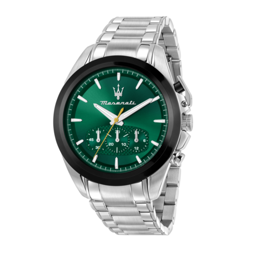 Reloj Maserati Hombre R8873612065 Cronógrafo Acero Analógico. Caja de acero de 43mm de diámetro. Bisel negro. Brazalete de acero inoxidable. Cierre desplegable. Esfera verde. Multifunción, cronógrafo y calendario. Cristal mineral. Movimiento quartz. Sumergible 100m. 3 años de garantía. Ref R8873612065