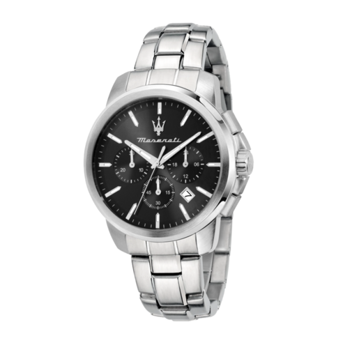 Reloj Maserati Hombre R8873621046 Cronógrafo Acero Analógico. Caja de acero de 42mm de diámetro. Bisel plateado. Brazalete de acero inoxidable. Cierre desplegable. Esfera negra. Multifunción, cronógrafo y calendario. Cristal mineral. Movimiento quartz. Sumergible 100m. 3 años de garantía. Ref R8873621046