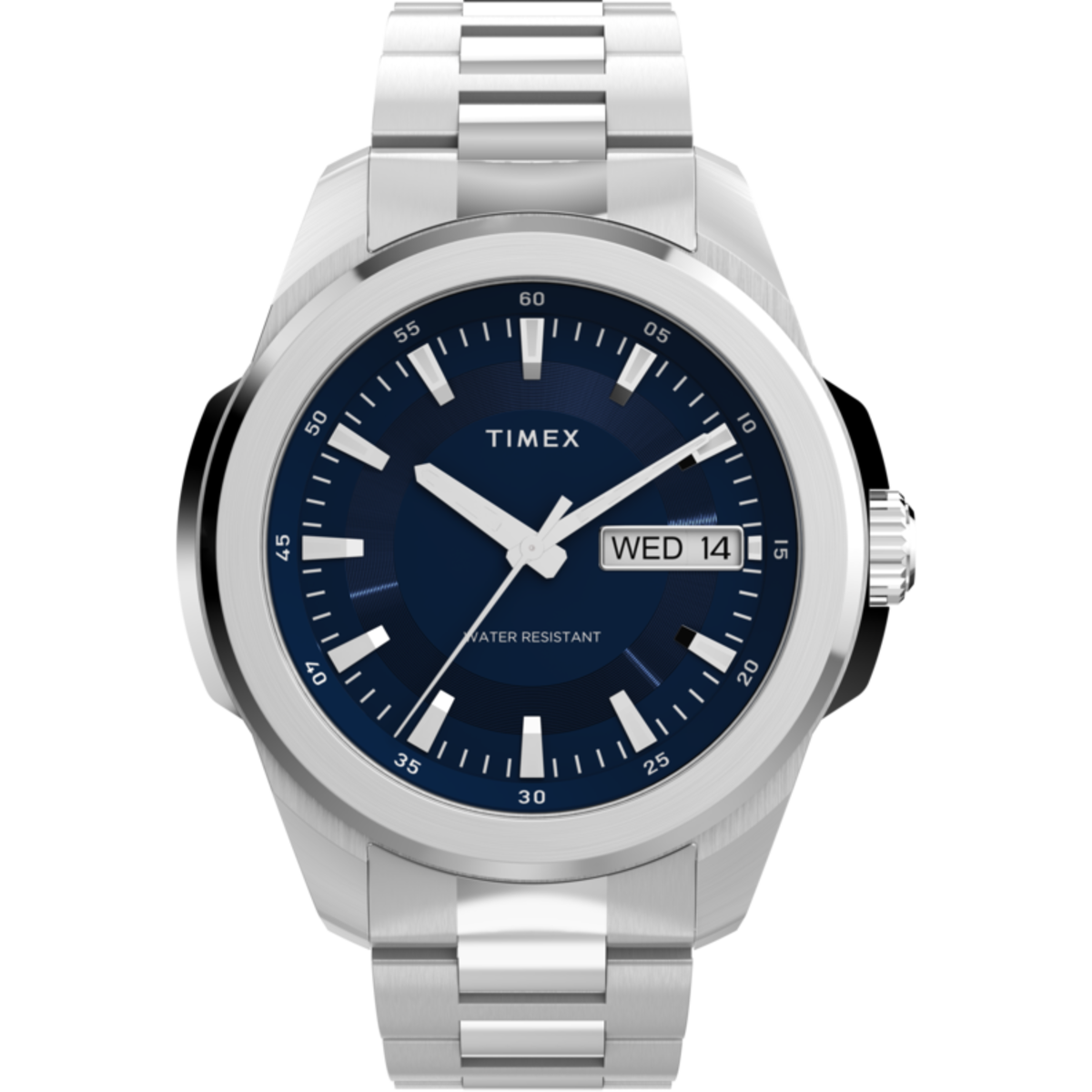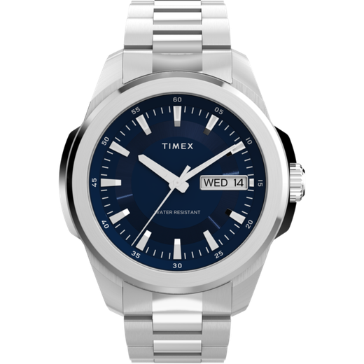 Reloj Timex Hombre TW2Y21100 Essex Acero Plateado Analógico. Caja de acero plateado de 45mm de diámetro. Bisel plateado. Brazalete de acero plateado. Cierre desplegable. Esfera azul. Multifunción, calendario. Cristal mineral. Movimiento quartz. Sumergible 50m. 3 años de garantía. Ref TW2Y21100