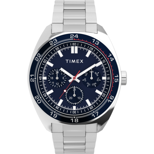 Reloj Timex Hombre TW2Y22700 Weston Acero Plateado Analógico. Caja de acero plateado de 45mm de diámetro. Bisel azul. Brazalete de acero plateado. Cierre desplegable. Esfera azul. Multifunción, subdial de fecha, día y hora de 24hrs. Cristal mineral. Movimiento quartz. Sumergible 50m. 3 años de garantía. Ref TW2Y22700