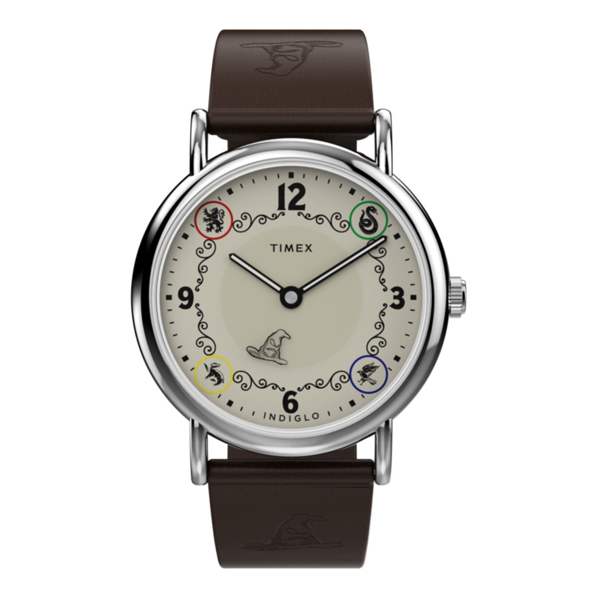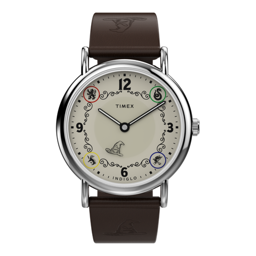 Reloj Timex Hombre TW2Y76300 Harry Potter Piel Marrón Latón Analógico. Caja de latón de 38mm de diámetro. Bisel plateado. Correa de piel sintética marrón. Cierre hebilla. Esfera crema con ilustración de los escudos de cada casa. Cristal mineral. Movimiento quartz. Sumergible 50m. 3 años de garantía. Ref TW2Y76300