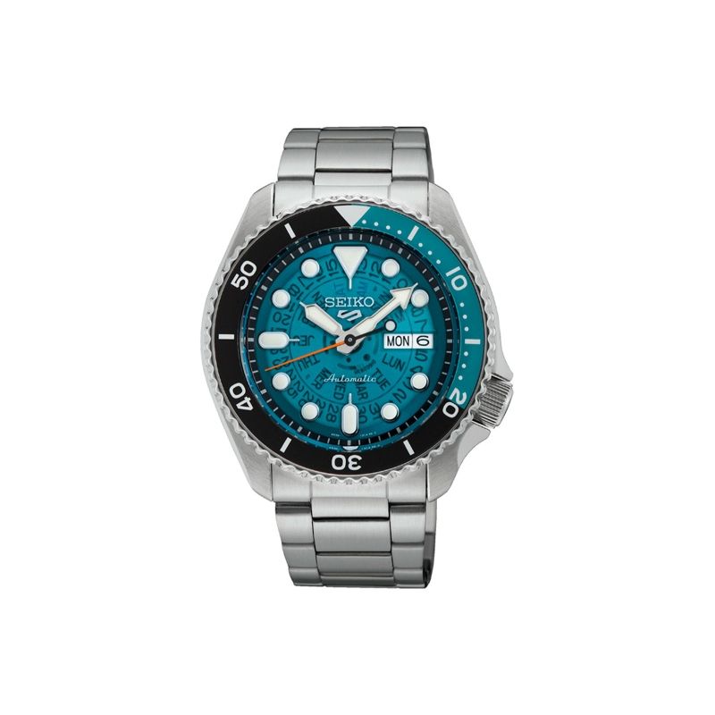 Seiko herrklocka SRPJ45K1 stål. 42,5 mm diameter stålhölje. Armband av stål. blå urtavla Tvåfärgad svart blå ram. Dubbel kalender. Nedsänkbar 100m. 3 års garanti. Ref. SRPJ45K1